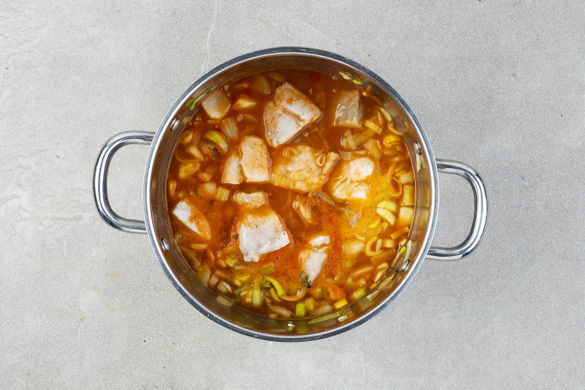 Wenn das Gemüse gar ist, den Fisch dazugeben und die Suppe einmal aufkochen lassen, dann ohne Deckel noch ca. 5Min. auf niedrigster Stufe ziehen lassen. Die Suppe nach Geschmack mit dem Rosmarin sowie Salz und Pfeffer würzen und servieren.