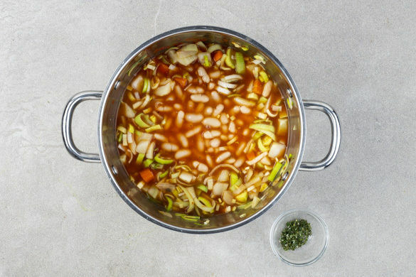 Die Bohnen samt Flüssigkeit unterrühren und die Suppe bei mittlerer Hitze abgedeckt 8–10Min. sanft köcheln lassen. Die Rosmarinnadeln abzupfen und fein schneiden.