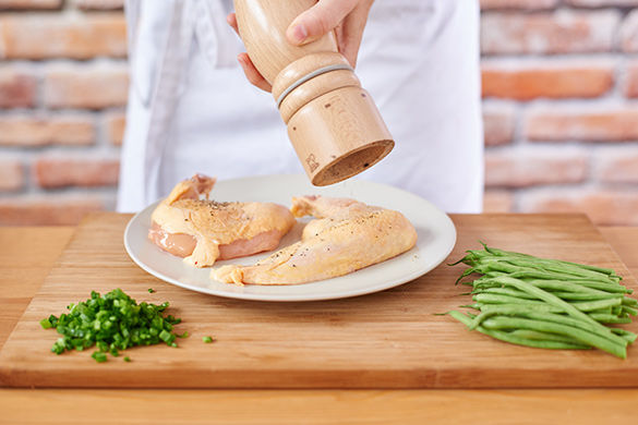 Inzwischen Bohnen waschen und die Enden entfernen. Den Schnittlauch waschen und in feine Ringe schneiden. Fleisch trocken tupfen und mit Salz und Pfeffer würzen.