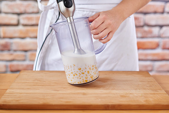 Inzwischen Mais abtropfen lassen. In ein hohes Gefäß geben, Hälfte der Milch zugießen und mit dem Stabmixer fein pürieren. Wer es etwas gröber will, nur kurz anpürieren.