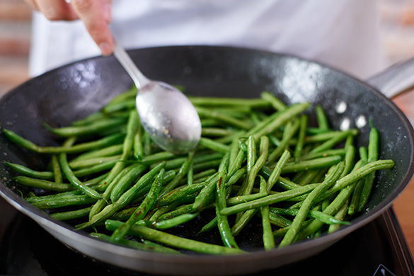 Fleisch-Pfanne auswischen, erneut mit 2EL Öl erhitzen, Bohnen ca. 5Min. bissfest braten. Mit Salz und einer Prise Zucker würzen, Schnittlauch unterheben. Kartoffelstampf evtl. kurz erwärmen und mit Fleisch und Bohnen anrichten.