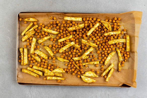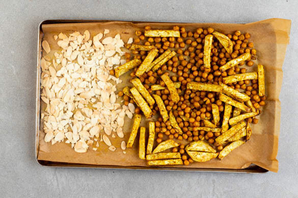 Den Sellerie und die Kichererbsen mit 2EL Olivenöl, der ½ der Gewürzmischung sowie je 1 Prise Salz und Pfeffer vermengen, auf einem mit Backpapier ausgelegten Backblech verteilen und 20–30Min. im Ofen goldbraun backen. Tipp: Wer mag, kann auch mehr von der Gewürzmischung verwenden.