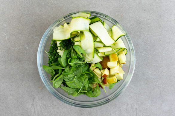 Inzwischen die Äpfel vierteln, entkernen und in kleine Würfel schneiden. Die Gurken mit einem Sparschäler rundum in breiten Streifen abschälen.