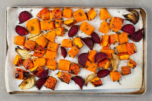 Die Bohnen in einem Sieb mit kaltem Wasser abspülen, abtropfen lassen und möglichst trocken tupfen. Nach ca. 12Min. Garzeit die Bohnen zu dem Gemüse geben und 6–7Min. mitbacken, bis der Kürbis und die Rote Bete gar und leicht gebräunt sind.
