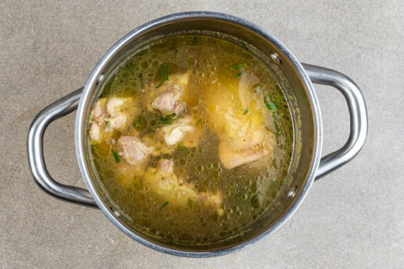 Das Fleisch trocken tupfen, mit der ½ des Dills in die kochende Brühe geben und abgedeckt bei niedriger Hitze in ca. 15Min. gar köcheln.