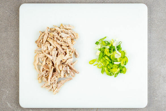 Den Reis in einem Sieb kalt abspülen, bis das Wasser klar bleibt. Das Fleisch nach ca. 15Min. Garzeit aus dem Topf nehmen, dann den Reis hineingeben und abgedeckt bei niedriger Hitze in 12–13Min. gar köcheln. Inzwischen das Fleisch mit sauberen Händen oder zwei Gabeln in kleine Stücke zupfen. Die Lauchzwiebel in feine Ringe schneiden.