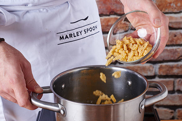 Die Pasta ca. 8-10Min. im Wasser bissfest kochen. Sobald die Nudeln gar sind, das Wasser abgießen und Pasta abtropfen lassen.