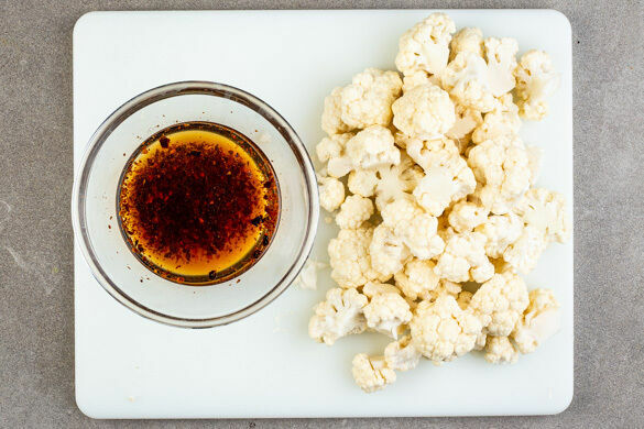 Den Backofen auf 240°C (220°C Umluft) vorheizen. Den Blumenkohl in mundgerechte Röschen schneiden, dabei den harten Strunk entfernen. Die ½ der Chiliflocken oder mehr nach Geschmack mit etwas heißem Wasser verrühren und beiseitestellen.
