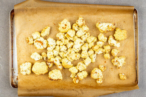 25g Mehl mit 30–35ml Wasser sowie je 1 Prise Salz und Pfeffer verrühren und mit dem Blumenkohl vermengen. Anschließend 1EL Pflanzenöl unterrühren, den Blumenkohl auf einem mit Backpapier ausgelegten Backblech verteilen und 13–15Min. im Ofen rösten. Nach der Hälfte der Zeit wenden. Den gerösteten Blumenkohl aus dem Ofen nehmen und nach Geschmack mit Salz und Pfeffer würzen.