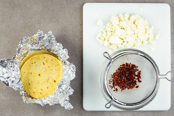 Die Tortillas aufeinanderstapeln, in Alufolie einwickeln und 3–4Min. im Ofen erwärmen. Den Feta mit den Fingern oder einer Gabel zerkrümeln. Die Chiliflocken in ein Sieb abgießen, dabei das Einweichwasser auffangen.
