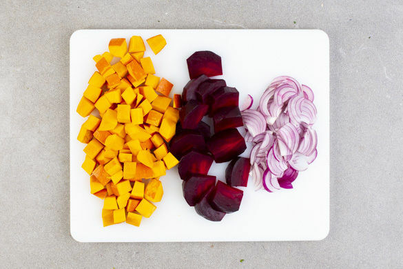 Den Backofen auf 240°C (220°C Umluft) vorheizen. Die Kürbisse halbieren, entkernen und in 1–2cm kleine Würfel schneiden. Die Roten Beten schälen und in ca. 1cm breite Spalten schneiden. Tipp: Am besten Küchenhandschuhe und Schürze tragen, da die Rote Bete stark färbt. Die Zwiebeln schälen, halbieren und in dünne Streifen schneiden.