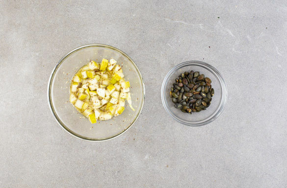 Die Kürbiskerne in einer kleinen Pfanne ohne Zugabe von Fett bei mittlerer Hitze 2–4Min. anrösten, bis sie knistern und goldbraun sind. Zum Abkühlen aus der Pfanne nehmen. Die Birne vierteln, vom Kerngehäuse befreien, in kleine Würfel schneiden und mit dem Dressing vermengen.