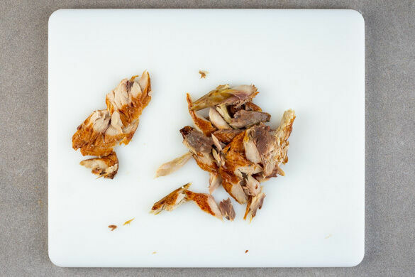 Die Makrele mit einem scharfen Messer von der Haut befreien und in mundgerechte Stücke zupfen, dabei evtl. größere Gräten entfernen.
