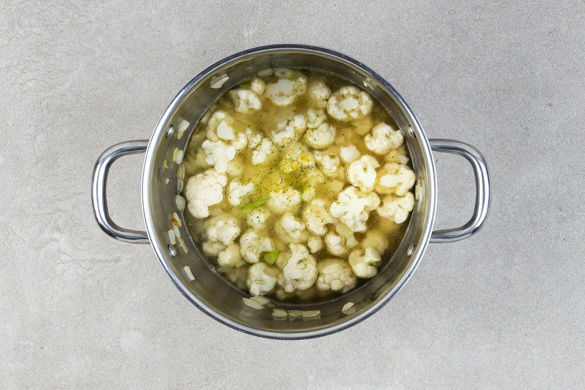 Die Blumenkohlröschen (bis auf die Garnitur), die Strunkwürfel, die weißen Lauchzwiebelringe und die Zwiebeln in einem mittelgroßen Topf mit 2EL Olivenöl bei mittlerer bis starker Hitze 2–3Min. farblos anschwitzen. Mit 700–800ml Wasser ablöschen und das Brühgewürz unterrühren. Die Suppe ca. 15Min. kochen lassen, bis der Blumenkohl weich ist.