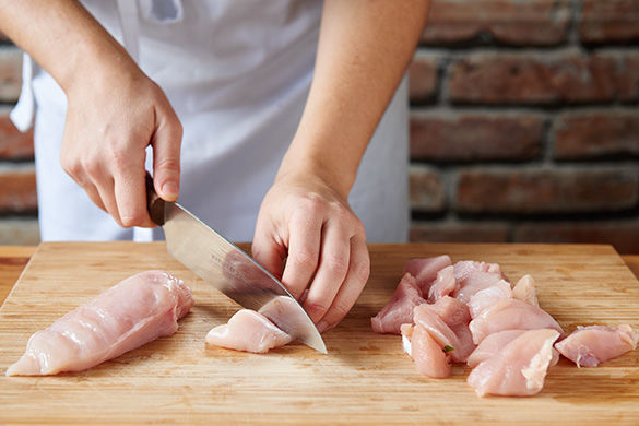 Einen Topf mit ausreichend gesalzenem Wasser für den Reis zum Kochen bringen. Das Fleisch trocken tupfen und in ca. 2cm große Stücke schneiden.