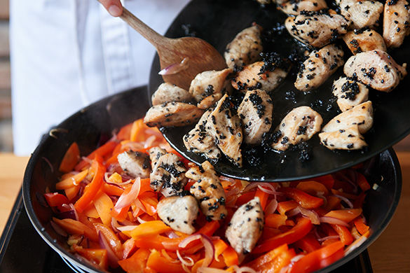 Wow! Diese Farben überzeugen uns: Wir braten rote Paprika mit orangener Karotte und garnieren mit grünem Koriander. Das helle zarte Fleisch marinieren wir nach dem Braten mit schwarzem Sesam und der weiße Reis vollendet das herrliche Bild. Bei uns isst eben auch das Auge mit.