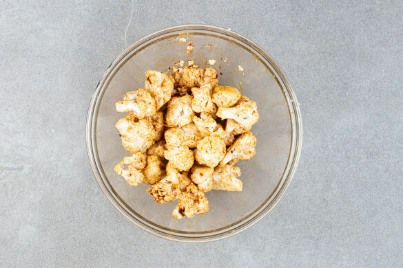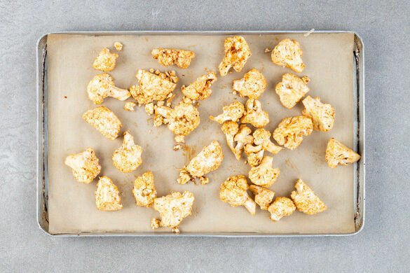 Den Blumenkohl auf einem mit Backpapier ausgelegten Backblech verteilen und 12–15Min. im Ofen rösten, bis der Blumenkohl gar ist.