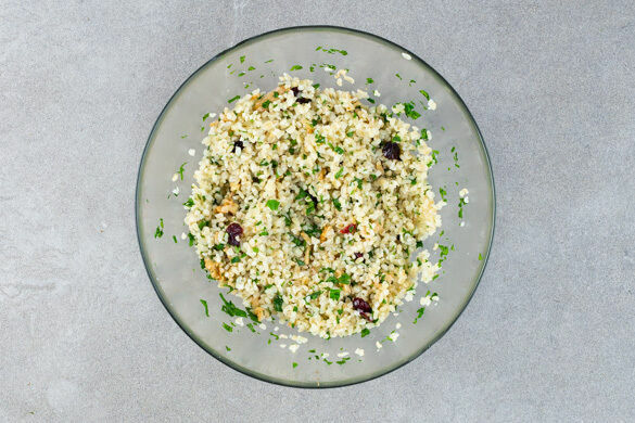 Zur deftig-würzigen Rindswurst servierst du gerösteten Blumenkohl, einen leichten Joghurtdip und lockeren Bulgur mit süßlich-herben Cranberrys und knackigen Walnüssen. Da bleibt keiner hungrig!