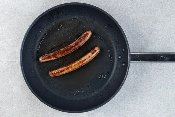 Die Würste in einer großen Pfanne mit 1EL Olivenöl bei mittlerer Hitze 8–10Min. rundum goldbraun braten. Aus der Pfanne nehmen und schräg in mundgerechte Stücke schneiden.