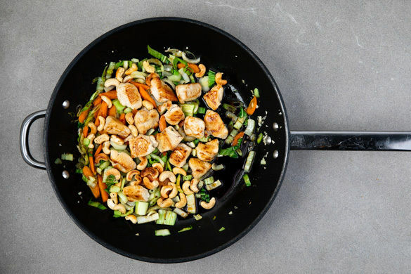 Die Cashews in einer zweiten mittelgroßen Pfanne mit 2EL Pflanzenöl bei mittlerer Hitze 1–2Min. unter Rühren goldbraun anbraten. In einem Schälchen beiseitestellen. Das Fleisch in dem Bratöl der Cashews bei mittlerer bis starker Hitze 4–5Min. goldbraun anbraten.