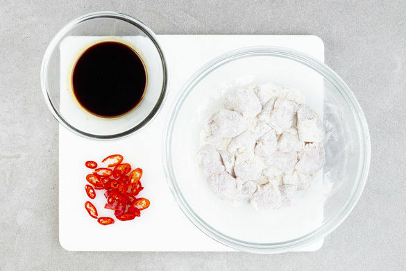 In einem kleinen Topf 300ml leicht gesalzenes Wasser für den Reis zum Kochen bringen. Das Fleisch trocken tupfen und mit 1EL Mehl vermengen. Die Peperoni in feine Ringe schneiden. Tipp: Für weniger Schärfe die Kerne entfernen. Die 1/2 der Sojasauce, das Ketjap Manis, 1EL Wasser sowie je 1–2 Prisen Salz und Zucker zu einer Würzsauce verrühren.