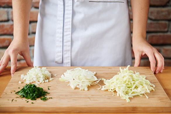 Inzwischen Zwiebel schälen, eine Hälfte fein würfeln, die andere in feine Streifen schneiden. Den Wirsing halbieren, Strunk, Schnittkante sowie äußere welke Blätter entfernen und in dünne Streifen schneiden. Die Petersilie fein hacken. Halben Brühwürfel in 250ml heißem Wasser auflösen.