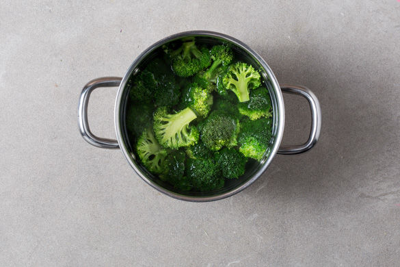 Inzwischen in einem zweiten, mittelgroßen Topf ausreichend leicht gesalzenes Wasser für den Brokkoli aufsetzen. Den Brokkoli in ca. 2-3cm große Stücke schneiden und, sobald das Wasser kocht, ca. 8-10Min. bissfest garen, dann durch ein Sieb abgießen.