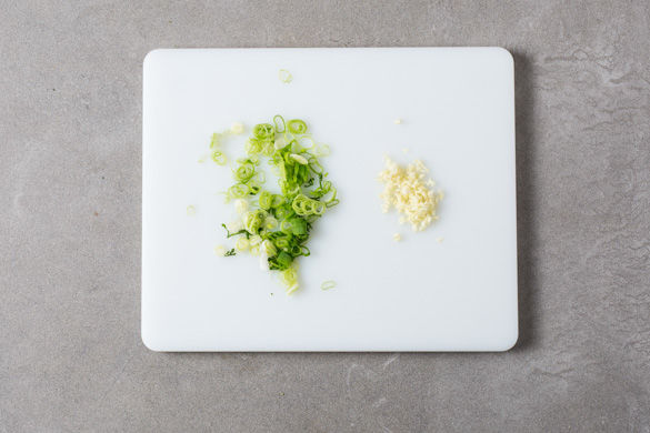 In der Zwischenzeit die Lauchzwiebel in feine Ringe schneiden. Den Knoblauch schälen und fein würfeln.