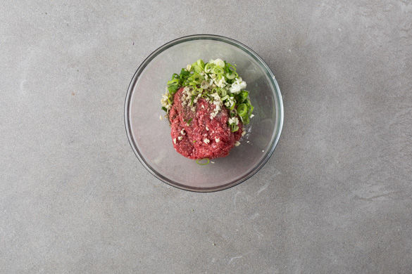 Das Hackfleisch mit dem Knoblauch und den Lauchzwiebeln verkneten, mit Salz und Pfeffer abschmecken.
