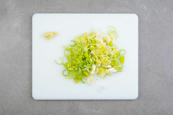 Den Lauch längs halbieren und quer in feine Streifen schneiden. Den Knoblauch schälen und fein würfeln. Die Zitronenschale abreiben, dann die Zitrone halbieren und auspressen. Das Brühgewürz in 800ml heißem Wasser auflösen.