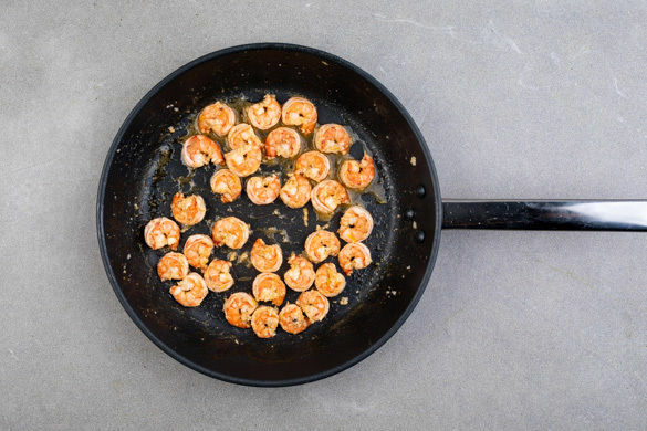 Die Zucchini längs halbieren und in dünne Scheiben schneiden. In derselben Pfanne mit 1EL Olivenöl bei mittlerer Hitze 4–5Min. von beiden Seiten anbraten. Die Zucchini mit je 1 kräftigen Prise Salz und Pfeffer würzen, dann die Garnelen zurück in die Pfanne geben und ca. 1Min. mitbraten.