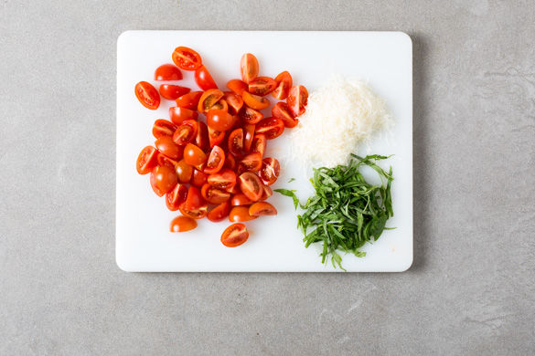 Die Kirschtomaten vierteln. Den Käse fein reiben. Die Basilikumblätter von den Stängeln zupfen und in feine Streifen schneiden.