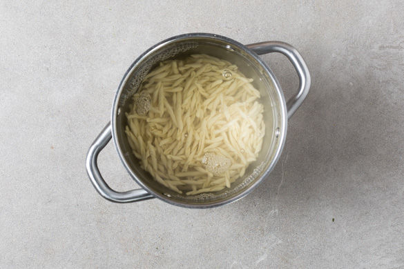 Sobald das Wasser kocht, die Pasta hineingeben und in ca. 10–12Min. bissfest kochen. In ein Sieb abgießen und kalt abschrecken. Beim Abgießen ca. 100ml Pastawasser für den letzten Schritt auffangen.