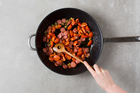 Inzwischen in einer großen Pfanne die Salsiccia mit dem Knoblauch und 1–2EL Olivenöl ca. 2–3Min. bei mittlerer Hitze anbraten. Dann die Kapern und die Tomaten hinzugeben und 1–2Min. mitbraten.