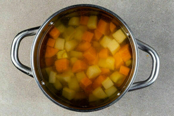 Den Backofen auf 220°C (200ºC Umluft) vorheizen. In einem großen Topf ausreichend gesalzenes Wasser für das Gemüse zum Kochen bringen. Die Süßkartoffeln und die Pastinaken schälen und in ca. 2cm große Würfel schneiden. Das Gemüse in das kochende Wasser geben und in 14–16Min. gar kochen.