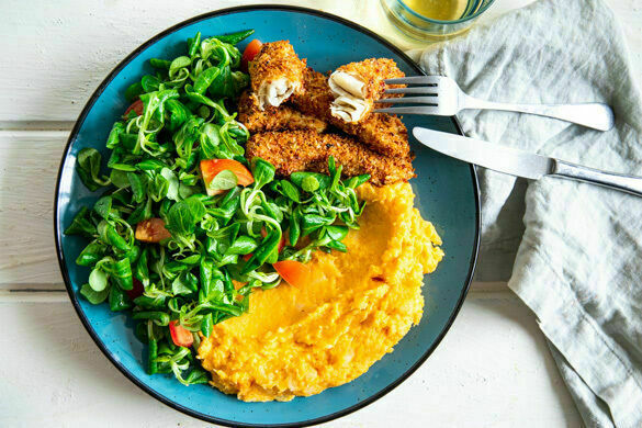 Der Seehecht vollzieht heute sein Wohlfühlprogramm: Er schlüpft in ein Mäntelchen aus knusprigen Pankokrumen und zarten, würzigen Käseflocken. Dann macht er es sich auf einem fluffigen Tagesbett aus Pastinaken und goldenen Süßkartoffeln bequem, bevor er im kühlenden Schatten vom Grün des Feldsalats ein Nickerchen hält. Das süße Nichtstun will schließlich gelernt sein!