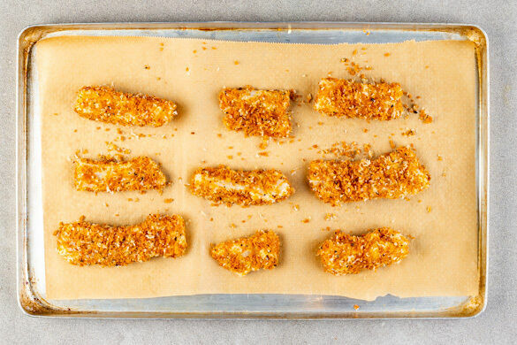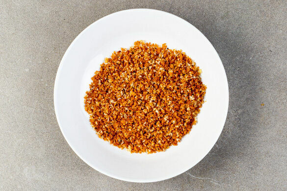 Das Panko-Paniermehl gleichmäßig auf einem mit Backpapier ausgelegten Backblech verteilen und 2–4Min. goldbraun rösten. Den Käse fein reiben und auf einem Teller mit dem Paniermehl, der Gewürzmischung, 1EL Olivenöl und 1 kräftigen Prise Salz vermengen.