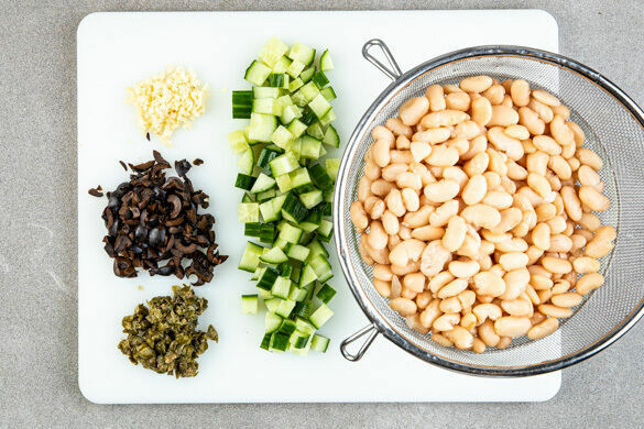 Die Bohnen in einem Sieb mit kaltem Wasser abspülen und abtropfen lassen. Den Knoblauch schälen und fein würfeln. Die Oliven und die Kapern fein schneiden. Die Gurken in ca. 2cm große Würfel schneiden.