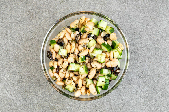 Mit einem Schneebesen 4EL Olivenöl, 2EL Essig, 2TL getrocknete Minze, 2TL Senf und 2TL Honig zu einem Dressing verrühren. Die Bohnen, den Knoblauch, die Oliven, die Kapern und die Gurken zugeben und gründlich unterheben.