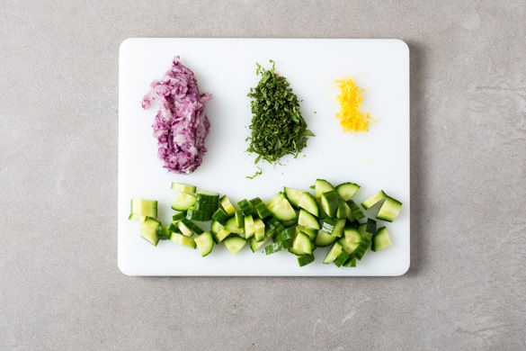 Den Grillofen auf 275°C vorheizen. Die Zwiebeln schälen und mit der groben Seite der Küchenreibe raspeln. Die Blätter der Minze vom Stängel streifen und fein hacken. Die Schale der Zitrone abreiben. Die Gurke längs vierteln und in ca. 1cm große Würfel schneiden.