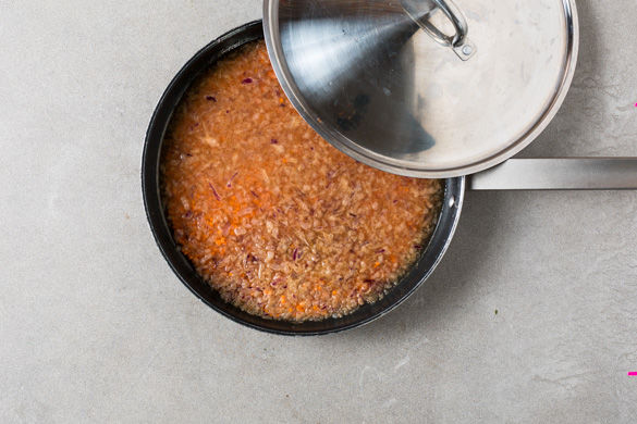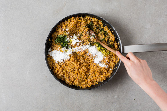 In einer mittleren Pfanne 1EL Olivenöl mittelhoch erwärmen und die Zwiebeln für ca. 1-2Min. anbraten. Die Linsen mit Gewürz, 1TL Salz und Pfeffer zu den Zwiebeln geben und mit 350ml Wasser ablöschen, mit Deckel auf niedriger Hitze ca. 7-10Min. leicht köcheln lassen. Ggf. mehr Wasser hinzufügen.