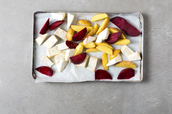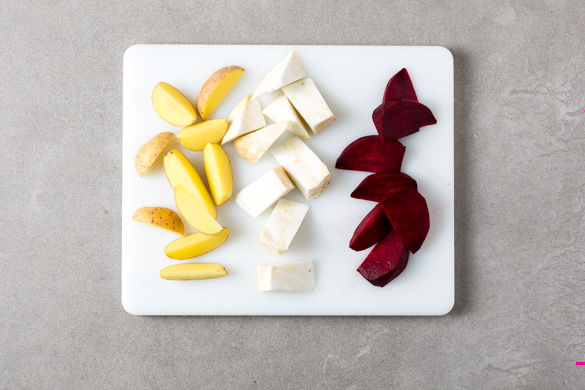 Den Ofen auf 190°C Umluft oder 200°C Ober-/Unterhitze vorheizen. Die Kartoffeln in ca. 2-3cm große Stücke schneiden. Den Knollensellerie schälen und in ca. 2-3cm große Stücke schneiden. Die Rote Beete schälen und in ca. 1cm große Spalten schneiden. Tipp: Da Rote Beete färbt, am Besten mit Handschuhen und Schürze arbeiten.