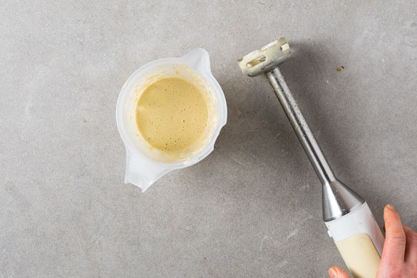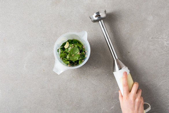 Die Sonnenblumenkerne mit Knoblauch und 3/4 der Kräuter sowie 1-2El Olivenöl mithilfe eines Stabmixers pürieren. Mit 1-2EL Zitronensaft und 1TL Zitronenabrieb sowie Salz und Pfeffer abschmecken und weiter pürieren. Tipp: Je nach gewünschter Konsistenz Wasser hinzufügen.