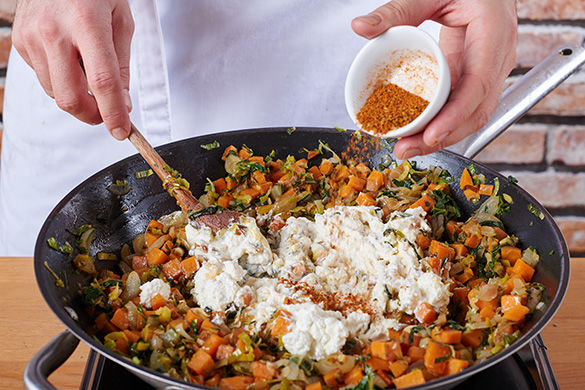 Große Pfanne mit 2EL Öl auf mittlere Stufe erhitzen. Süßkartoffeln, Knoblauch und Porree ca. 5Min. anbraten. Nun Pak Choi unterheben und weitere 3-5Min. anbraten, bis das gesamte Gemüse weich ist. Zum Schluss Ricotta und Gewürz unterheben, mit Salz und Pfeffer abschmecken.