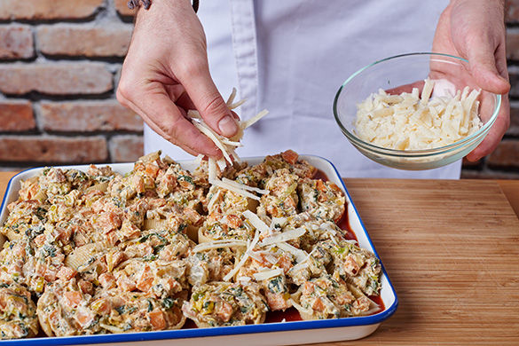 Muscheln haben immer kleine Geheimnisse. Wieso sollte das bei unserer Muschel-Pasta also anders sein? Psst, wir füllen allerlei Gemüse und Ricotta in die kleinen Schönheiten, betten sie in Tomatensauce und geben sie zum Garen in den Ofen. Wenn du ganz genau hinhörst, kannst du hören, was sie erzählen.