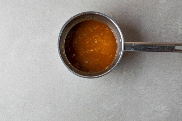 Die Zwiebeln und den Knoblauch in einem kleinen Topf mit 1EL Pflanzenöl bei mittlerer Hitze 2–3Min. anschwitzen. 1EL Mehl unterrühren, dann mit 150ml Wasser, der Hoisinsauce und der Teriyakisauce ablöschen. Die ½ des Currypulvers unterrühren und die Sauce 5–6Min. auf niedriger Hitze sanft köcheln lassen.