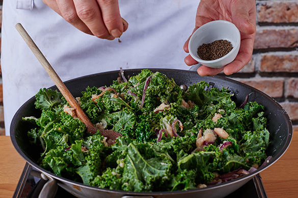 Nun Kümmel, Grünkohl und die Bohnen zu den Zwiebel geben. Erhitzen bis der Grünkohl leicht zusammenfällt. Die Bohnen mit einem Löffel leicht andrücken. Alles gut mit Salz und Pfeffer würzen.
