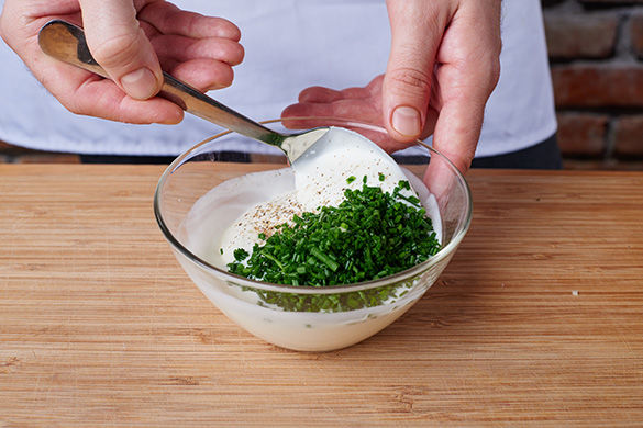 Schnittlauch mit dem Joghurt in einer Schüssel vermengen und mit Salz und Pfeffer abschmecken. Quesadillas aus dem Ofen nehmen, vierteln und mit Joghurt-Dip und Tomaten anrichten.