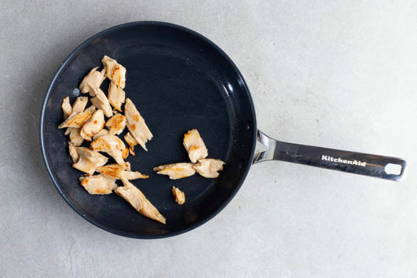 Die veganen Hähnchenschnetzel in mundgerechte Stücke zerkleinern und in einer großen Pfanne mit 2EL Pflanzenöl bei mittlerer Hitze in 5–6Min. goldbraun anbraten. Die Schnetzel mit je 1 kräftigen Prise Salz und Pfeffer würzen.