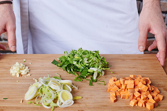 Inzwischen Süßkartoffel waschen und klein würfeln oder grob raspeln. Knoblauch schälen und fein hacken. Enden des Porrees entfernen, dann in dünne Scheiben schneiden. Pak Choi fein hacken.